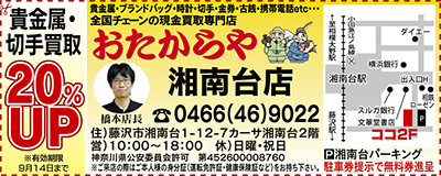コレクション切手、引き出しに眠ってませんか?高価買取で評判の「おたからや湘南台店」では現在、切手の買取強化中!シートはもちろん、バラでもOK◎また、高値をキープしている金・プラチナも高価買取。「片方だけのピアスや切れたネックレスも買取ります」と橋本店長。その他ブランド品はもちろん、使いかけの香水や壊れた携帯電話まで幅広く買取ってくれる同店。8月からウィスキーやブランデーの洋酒買取も開始!この機会にぜひ。