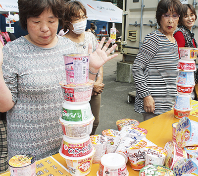 模擬店やハズレなしの抽選会、新鮮野菜の即売会など誰でも気軽に立ち寄れる。ハロウィンにちなんで仮装姿で来場した子どもには特典も用意。時間内に積み上げた数だけ持ち帰ることができる「ラーメンタワー」(参加費300円/午後2時〜)などのユニークなゲームも楽しめる(=写真)。最新ガス機器や太陽光発電システムの展示販売、ウォーターサーバー「アクアクララ」の試飲コーナーも設けられる。時間は午前10時から午後4時。駐車場あり。アクセスは八王子原交差点すぐ、バス停「湘南カントリークラブ前」から徒歩30秒。詳細は【電話】0467・54・5000