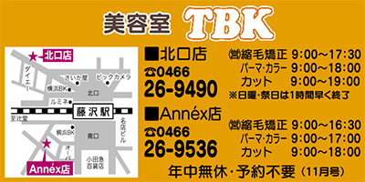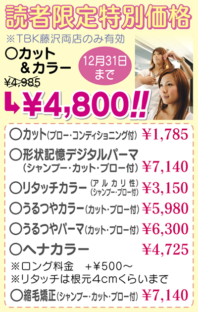 綺麗な髪で年の瀬を迎えたい、でもなるべくオトクに…という貴方には、リーズナブルな価格と「価格以上の満足」を提供する技術力で、幅広い世代から人気の『美容室TBK』。今月のオススメはカット&カラー通常4985円→4800円、髪にやさしいトリートメントパーマがなんと、3780円(シャンプー・カット・ブロー付)。髪ツヤUPしたいなら、うるつやパーマ、カラーをお試しあれ。