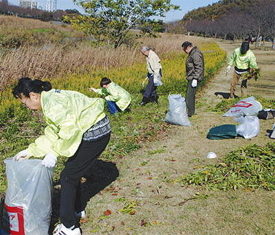 藤沢北ロータリークラブ(岡崎記久子会長)が11月29日、引地川沿いの雑草の駆除を初めて行った。作業を行ったのは、天神橋から大庭鷹匠橋まで、引地川親水公園を中心とした約1Kmの範囲の両岸。