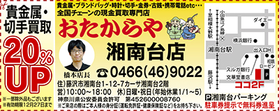 高価買取に定評のある「おたからや湘南台店」では、切れたネックレスやバラ切手、ブランデーやウィスキーなどの洋酒まで買取ってくれる。今ならクーポン持参で貴金属・切手買取20%UP!「迷ったら処分する前にお持ちください」と橋本店長。