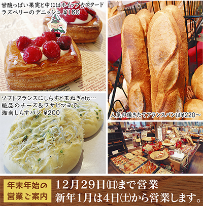 辻堂駅南口の新ベーカリー「パンステージ リップル」が年末感謝企画として12月20日(金)から26日(木)の1週間、この紙面持参の人限定で、パン全品10%引きとなる企画を開催する。