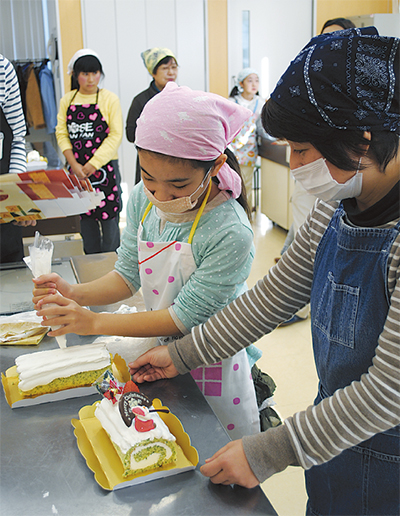 参加者らは午前中に田代農園の小松菜を収穫。その後、小松菜を使ったクリスマスロールケーキ作りに挑戦した。講師は、藤沢マイスターでシュテルン洋菓子店社長の渡部昭さんが務め、実際に一緒に作りながら、丁寧に指導した。