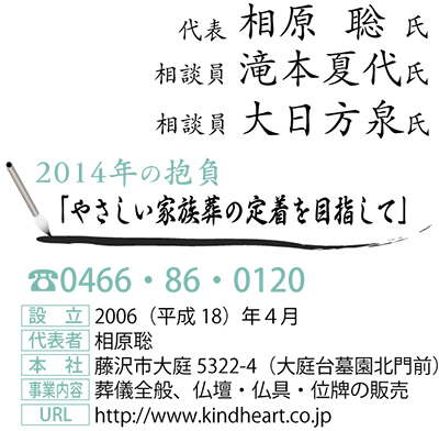 「やさしい心」「親切なおもてなし」という意味を持つ社名とおり、ほっとできるひと時、温かい気持ちになれる瞬間、安らぐ時間を提供している。家族葬専用に設計されたホールでは、「大切な別れをゆっくりと過ごせた」という声が多い。また葬儀だけでなく、その後の納骨やお墓の管理などのフォローの手厚さも同社が支持される理由だろう。