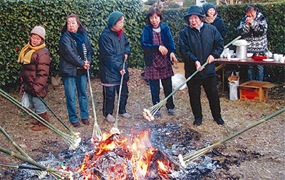用田地区で1月14日、道祖神塔の前で伝統のどんど焼きが行われた。地域住民らは正月のしめ飾りや、門松、古い札、書き初めなどに火を入れ、1年の無病息災や家内安全を願った。