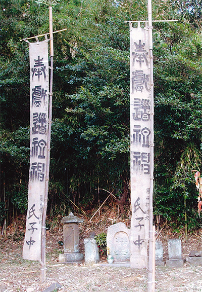 また、旧字体で「天保十(1839)年正月 用田村目坂 奉納道祖神 氏子中」と記された幟旗2本が、道祖神塔の前に奉納されるのが特長だ。同地区の尾上稔さんによれば、「現在は『女坂』という表記なので、江戸時代から伝わる幟旗であることは間違いない。こうした幟旗が現在も立てられている地域は、藤沢市内では無いと聞いている」と話す。木箱に奉納された幟旗は、歴代の氏子らが持ち回りで保管してきたという。「記録には残っていないが、村に医者がおらず、コレラなどの疫病が流行った江戸時代、集落の無病息災を祈念し、道祖神を祀ってきた幟旗だと思われる。この地区の財産として、大切に保管していきたい」と尾上さんは話している。