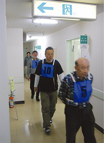 警報装置の効果を把握することを目的とした避難訓練には、聴覚障害者9人と同センター職員20人程度が参加。2階のレントゲン室から出火したと想定し、音の警報のみ、光の警報のみ、音と光警報の併用による火災警報を計4回行った。それぞれ避難場所への移動時間を測定、アンケート調査も行った。