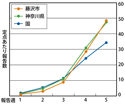 第5週の神奈川県と国の定点あたりの患者発生数は、それぞれ47・96人と34・44人で、藤沢市は県・国ともに上回った。