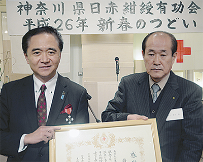 日赤神奈川県支部長を務める黒岩祐治県知事は「皆様の温かい特別事業募金で、横浜市立みなと赤十字病院の資器材を整備していただき心から感謝している。紺綬有功会のさらなる発展を祈念する」と述べた。