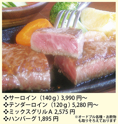ワイルドな旨みのサーロインは140g〜、繊細な美味しさのテンダーロインは120g〜と、女性や高齢者でも食べやすいのが嬉しい。表面はカリッ、中はジューシーに焼き上げた厚みのある柔らかい肉に、旨みを引き立てる特製ソースを絡めて至福のひと時を。 ビーフ、ハンバーグ、チキン、ポークがワンプレートで楽しめる「ミックスグリルA」や肉に合う手ごろなワイン、オードブルなどの品ぞろえも豊富だ。