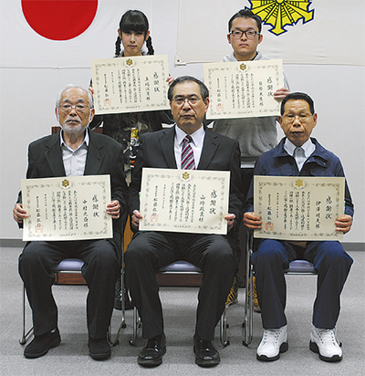 表彰を受けたのは遠藤在住の伊澤明夫さん(67)と山崎誠良さん(59)、片瀬在住の中村光益さん(77)、横浜市在住の上嶋深月さん(19)と笹原大生さん(19)の5人。