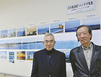 会期中は、鵠沼海岸在住のデザイナー市川勝典さん(69)による「江の島360度パノラマ写真」をはじめ、7年に渡って約30カ所から撮影した江の島の写真をメインに展示。そのほか、地元の写真愛好家によるダイヤモンド富士やパール富士、昭和初期のモノクロ写真、富士山が描かれた浮世絵など、約300点が展示されている。午前10時から午後4時(月曜休館)。