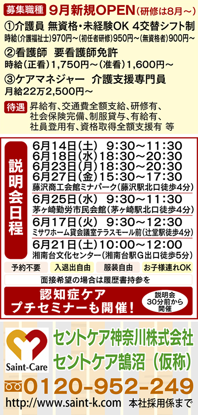 県内全域で総合福祉サービスを提供する「セントケア神奈川(株)」が、小規模多機能施設とグループホーム併設の「セントケア鵠沼」(仮称)を9月にオープンし、現在、オープニングスタッフを募集している。