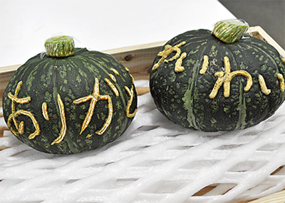 同店では文字の入ったカボチャの販売も開始している。市内石川の市川キヨ子さんが栽培しているもので、実が小さいうちに傷をつけ、名前などを書き込むと成長した際にくっきりと表れるという。名前を入れることで「自分の名前を見つけた子どもが、『これ食べたい』と野菜嫌い解消のきっかけになったケースもある」と佐藤店長。