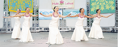 今年初めて実施された45歳以上のメンバーから構成されるクプナグループ部門。「ティアレフラグループ」(鵠沼石上・堀栄子主宰)の5人のメンバーらは、作曲家が妻を美しいレイに例えて愛を歌った音楽に合わせて、白いドレスとピンク色のレイで新婚時の初々しさを表現。初代グランプリに輝いた。堀さんは、「家事や仕事も忙しい中で練習の成果を発揮し、チームワークも良かった。頑張りを評価したい」と話した。