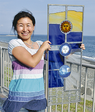 「雨上がりに虹が出たら、誰もが『虹だ!』ってパッと笑顔になって喜ぶでしょ。そんな虹のように、見た人がニコッと笑顔になる作品を創りたい」。そう笑顔で語るのは、オブジェの制作者で、グラスアーティストとして2009年から江の島のアートイベントに参加する石井千晶さん(茅ヶ崎市在住)。作家として数々の作品展で入賞経験を持つほか、個人宅の玄関窓や表札、店舗看板を制作受注。職人としての顔も併せ持つ。