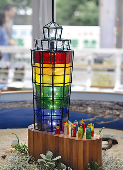実物に近づけるため、点滅するLEDライトのほか、背景のパノラマ写真や土台は、湘南の作家らがセッティグ。各々の持ち味を生かし、渾身の作品に仕上げた。「土台に載せて、周りに砂や植物を添えて初めて『良いな』と思った。全体の雰囲気に作品が溶け込んだ時がとっても幸せ」。