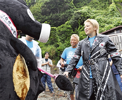 その後、江の島島内に移動し、両選手の指導のもと、プロレス技からアレンジした「ビーチストレッチプロレス」を体験。コブラツイストや必殺キックを学んだほか、堀田さんから実際に技を掛けられた参加者は、「痛たたたっ!」「やばいっ」などとプロの技を体感し、会場を沸かせていた。また、海さくら所属の江の島非公認キャラ「エノシゴ君」が堀田さんを挑発すると、堀田さんは「なめんなよっ!」とコスチュームに着替え、戦闘モードに。オリジナル入場曲で再登場し、チェーンや迫力あるパフォーマンスでエノシゴ君を締め上げた。