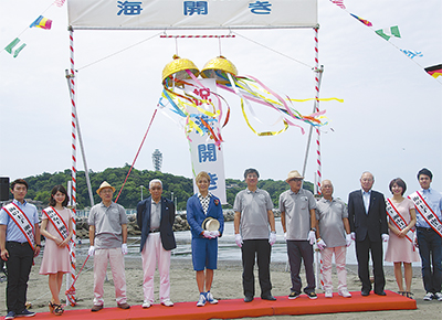 夏の訪れを告げる海開きが7月1日、片瀬海岸西浜で行われ、シーズン中の海水浴場の安全を願った。
