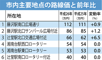 藤沢市内の最高路線価は、27年連続で藤沢駅南口広場通り(南藤沢1丁目付近)で、1平方メートルあたりの価格は112万円。前年より0・9%(1万円)上がり、08年以来、6年ぶりに上昇に転じた。また、藤沢駅北口サンパール広場付近も前年より1・2%(1万円)上がり、86万円となった。