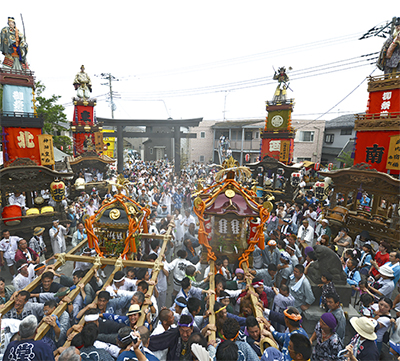 26日の午前8時30分から各町内子供御輿渡御、午後5時からは奉納太鼓の披露が行われる。27日は午前7時30分から例大祭神事、8時30分からは神社御輿渡御が開始。山車とお囃子は午後1時30分から。御輿と山車が合流するのは、同神社境内で3時30分ごろ。