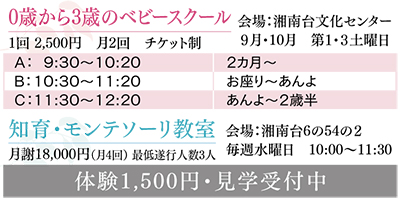 1歳半から3歳半を対象とした「知育・モンテソーリ教室」も9月開校。「世界でも注目される教育法で子育ての楽しさを実感しませんか?」とにっこり。