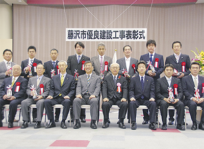 2014年度藤沢市優良建設工事表彰式が10月16日、藤沢市民会館で行われた。当日は受賞11工事の請負業者10社と1団体の代表者が鈴木恒夫藤沢市長から賞状などを手渡された。