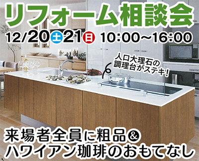 キッチン・お風呂のリフォームをそろそろ考えているという方は、12月20日(土)・21日(日)10時〜16時、トクラス藤沢ショールームで開催されるリフォーム相談会へ(主催/大和ハウスリフォーム(株))。