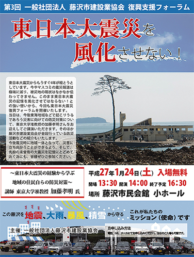 (一社)藤沢市建設業協会(綾 久会長)による「東日本大震災を風化させない!」と題した復興支援フォーラムが1月24日(土)、藤沢市民会館で開催される。講師に東京大学准教授の加藤孝明氏を招き、今後東海地域などで発生するとされる災害に向けての対策について語る。午後2時開演、入場無料。