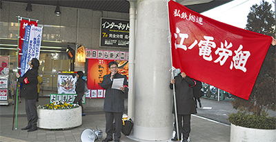 江ノ島電鉄労働組合(岩崎幸司委員長)は2月16日、藤沢駅南口ロータリーで江ノ電バス利用者や市民への理解を求めるアピール行動を実施した。