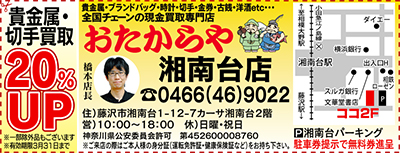 引っ越しや部屋の片づけで出た不用品、処分するのはちょっと待った!それ、お宝かも。切手やアクセサリー、ブランドのバッグや洋酒など高額査定に定評のある「おたからや湘南台店」に持ち込んでみて。丁寧に査定し、その場で現金化。捨てるはずの物が思わぬ臨時収入に!「こんな物でも?」と不安な時は事前に電話で問い合わせてもOK。 間もなく4周年を迎える同店。今なら査定後、店長とじゃんけんし、勝った人には粗品をプレゼント!