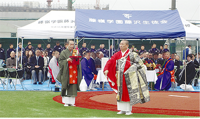 竣工式には関係者や生徒、保護者ら約200人が参加、法要を見守った。濱谷校長は「授業でも活用し、ここで心身ともに強くして21世紀のリーダーを育成していきたい」とあいさつ。藤沢翔陵高校との野球とサッカーの竣工記念試合も行い盛り上がりを見せた。