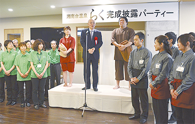 湘南台温泉「らく」(湘南台2の7の5)のオープン前日の5月1日、関係者や地域の人など約160人を招いた完成披露パーティーが同所で行われた。