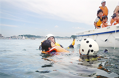 ライフジャケットを着用し、事前に海上保安庁湘南海上保安署職員から落水時の注意を受けた団員らは、2隻のボートで湘南港を出港。保安署職員が海中で見守る中、溺水者役の団員は船から海へと飛び込み、「助けて」と大きな声で救助を求めた。船から投げ入れられた、ひも付きのペットボトルを掴み、船へと無事引き上げられた。