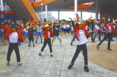 路上や公共の場などで一般通行人に扮した仕掛け人が突然ダンスを始め、周囲に驚きと感動を与える「フラッシュモブ」。練習会や、Web上の公開動画を見てダンスを覚えてきた100人以上の児童らは、マイケルに扮し、楽曲「Beat It」に合わせたキレの良いダンスを披露した。