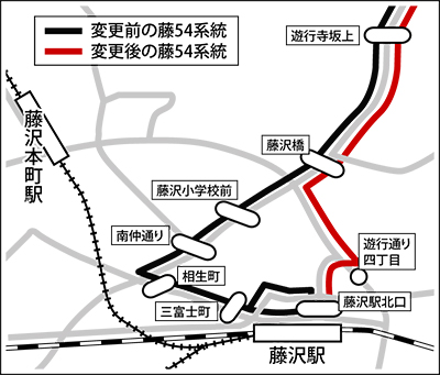 変更後は駅北口を出発後、藤沢商工会館前を通過して国道467号線を北上。藤沢橋の信号を遊行寺方面に曲がり、従来のルートを走行する。