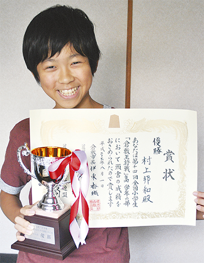 明治小学校の村上邦和君(6年)が8月1日、岡山県倉敷市で開かれた「第14回全国小学生倉敷王将戦」高学年の部に県代表として出場し、初優勝を果たした。村上君にとって、他大会も含め全国大会での優勝は初めての経験で、「最後のチャンスだったので、本当に嬉しい」と話した。