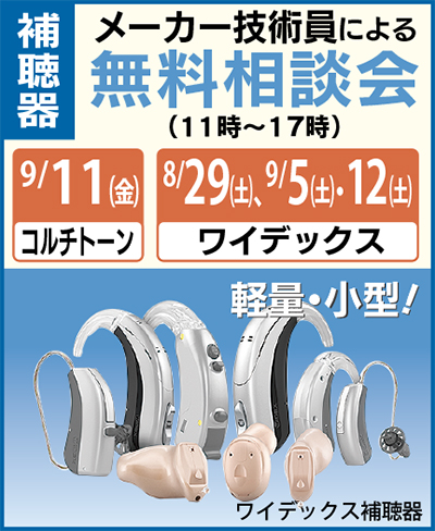 藤沢の小田急百貨店5F「メガネ・ニキヨー」では、9月22日(火)まで補聴器販売会を開催中。8月29日(土)、9月5日(土)・11日(金)・12日(土)はメーカー技術員による無料相談会も実施。聞こえのプロが一人ひとりの聴覚や生活に合わせた補聴器を提案してくれるので、「もっと早く相談すれば良かった」という喜びの声が届く。今の補聴器に不満がある人や、ご家族も気軽に相談を。