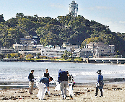 江の島大橋から鎌倉市腰越海岸にかけてビーチクリーンを実施している「江ノ島湾護美さぁくる」(会員数約25人・齋藤史朗代表)に製薬会社のグラクソ・スミスクライン(株)の有志らが加わり10月26日、合同でごみ拾いを行った。
