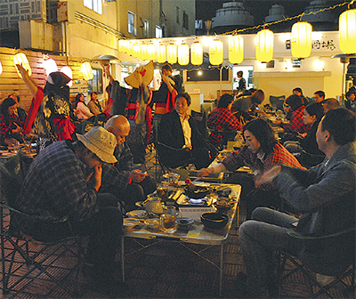 関係者らが集って16日に行われたプレオープンでは、秋田から重要無形民俗文化財「西馬音内盆踊り」の踊り子が訪れ、踊りを披露。参加者は夜空を見上げながら熱々の鍋を囲んで楽しいひと時を過ごした。