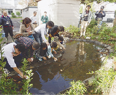 村岡中学校(若林豊校長)の南東の角地に、生徒の父親らで組織される「おやじの会」が手作りしたビオトープが完成した。11月15日には披露式典が行われ、ため池に藤沢メダカ約70匹が放流された。