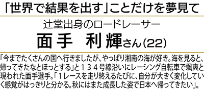 自転車ロードレースの本場・フランスへと渡り、世界の強豪と肩を並べて活躍する若きレーサーがいる。面手(おもて)利輝。高砂小、高浜中出身の22歳。ロードレースの最高峰ツール・ド・フランス出場をめざす日本チーム「エキップアサダ エカーズ」の強化メンバーとして、4年前からフランスでの競技生活を送ってきた。この1月からは日本チームを離れ、フランス人ばかりで構成される地元チームへの移籍を決断。あえて厳しい環境に身を置く、その真意に迫った。