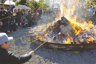 炎の勢いが収まると参拝者は、竹竿の先に突き刺した団子を火へかざし、願いを込めて頬張る姿が見られた。