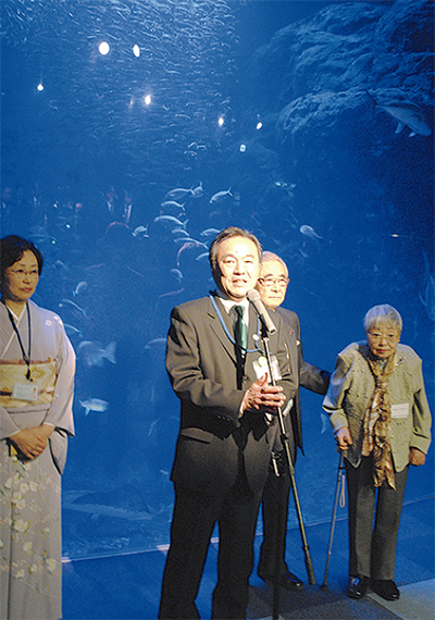 当日は鈴木恒夫藤沢市長や星野剛士衆議院議員をはじめ来賓ら約160人が巨大な水槽の前に集まった。あいさつに立った同社の相原代表取締役社長は「地域の皆様の支えがあり、半世紀にわたり事業を続けることができた。水は命の起源とも言える。その水の大切さを改めて感じてもらえると嬉しい」と述べた。