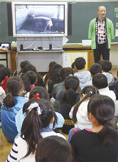 特別授業に参加したのは3年生の児童約90人。豚の生態や、生後半年ほどで120kg近くに育ち、出荷されていく養豚の実態などを学んだ。