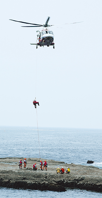 当日は南消防署指揮隊、高度救助隊、鵠沼水難救助隊、横浜市消防局航空隊から50人が参加。プレジャーボートの転覆や釣り人の落水事故を想定し、無線交信、ヘリとの機体誘導、救助艇とヘリの連携救出訓練などを行った。