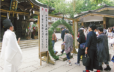 その後、参拝者は相原宮司らの後に続いて辺津宮へ向かい、古歌「水無月の夏越の祓えする人は千年の生命のぶというなり」を口ずさみながら、茅草で作られた大きな輪を八の字を描くようにして3回くぐり抜け、身を清めた。