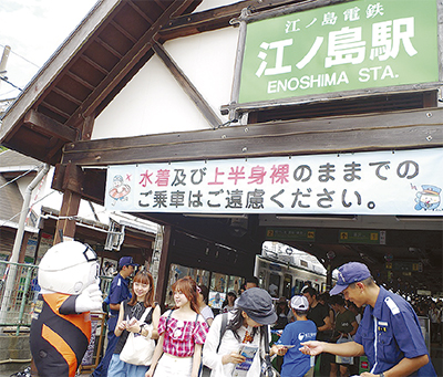 江の島に拠点を置く海上保安庁湘南海上保安署(和田聡明署長)は8月16日、江ノ島電鉄江ノ島駅前で「海の安全運動」を行った。