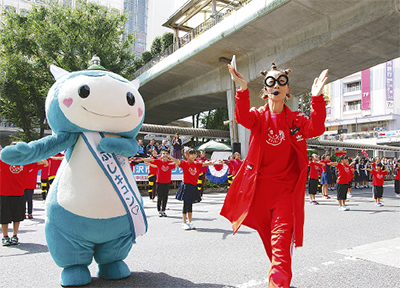 25日には「大パレード」の前に、多数のヒット曲の振付で有名な市内在住の振付演出家、南流石さん率いるダンスチームら約300人が藤沢駅南口ロータリーに集結。湘南ドルフィンズ・マーチングバンドや湘南台高校吹奏楽部「White Shooting Stars」などによる、シティプロモーションテーマソング「キュンとさせるこのまちで。」の演奏が始まると、約30人の小学生ダンサーが元気よく”キュンダンス”を披露した。公式マスコットキャラクター「ふじキュン♡」もチームに加わり、お祭りムードを盛り上げた。