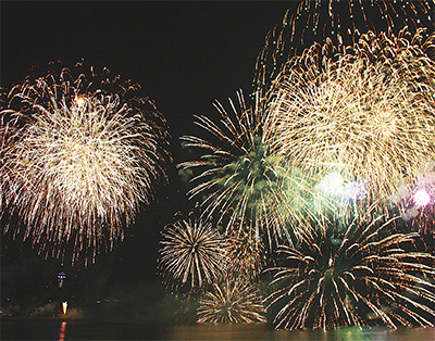 江の島を背景に、3000発の花火が次々に舞い上がった。音楽とともに舞い散る色とりどりの火花や、滝のように流れ落ちる金色の花火、さらに特大の2尺玉が轟音とともに夜空に大輪の花を咲かせると、詰めかけた観客は大きな歓声を上げ、拍手を送っていた。